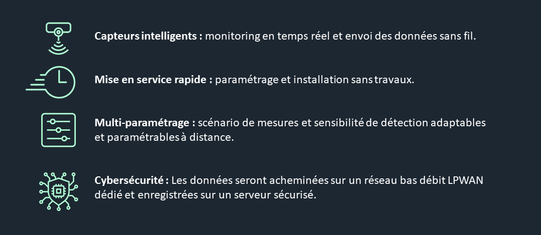 Sachant cela, nous vous proposons des capteurs pour mesurer le niveau de qualité de l’air dans vos espaces. Une fois les données collectées et remontées sur une plateforme SaaS sécurisée, l’analyse de ces données vous permettra d’établir un plan d’actions d’amélioration des conditions de travail. Vous pourrez, par exemple, agir sur la ventilation ou le chauffage, via un système de pilotage de vos bâtiments (GTB).